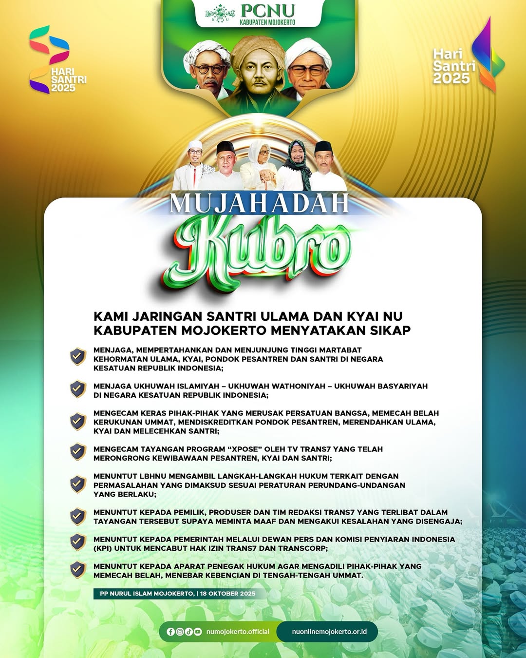 Kami jaringan santri, ulama, dan kyai NU Kabupaten Mojokerto menyatakan sikap :